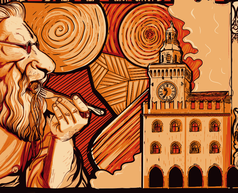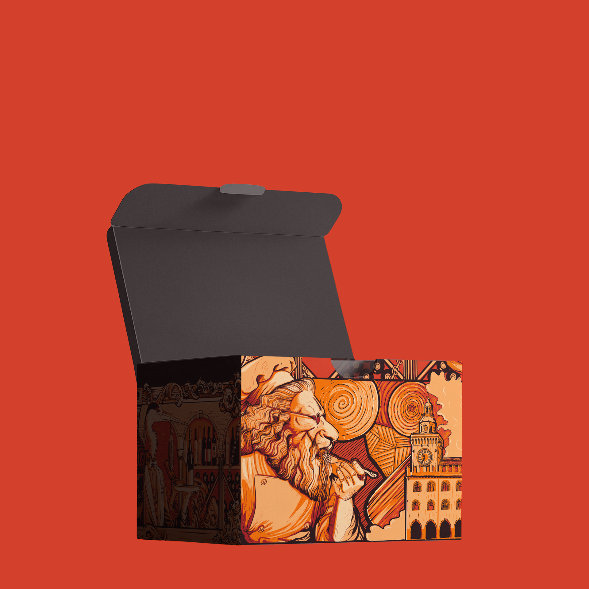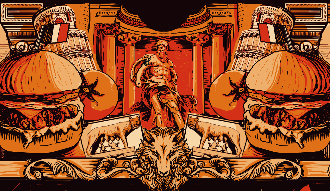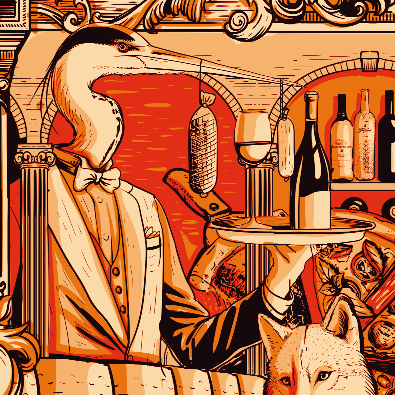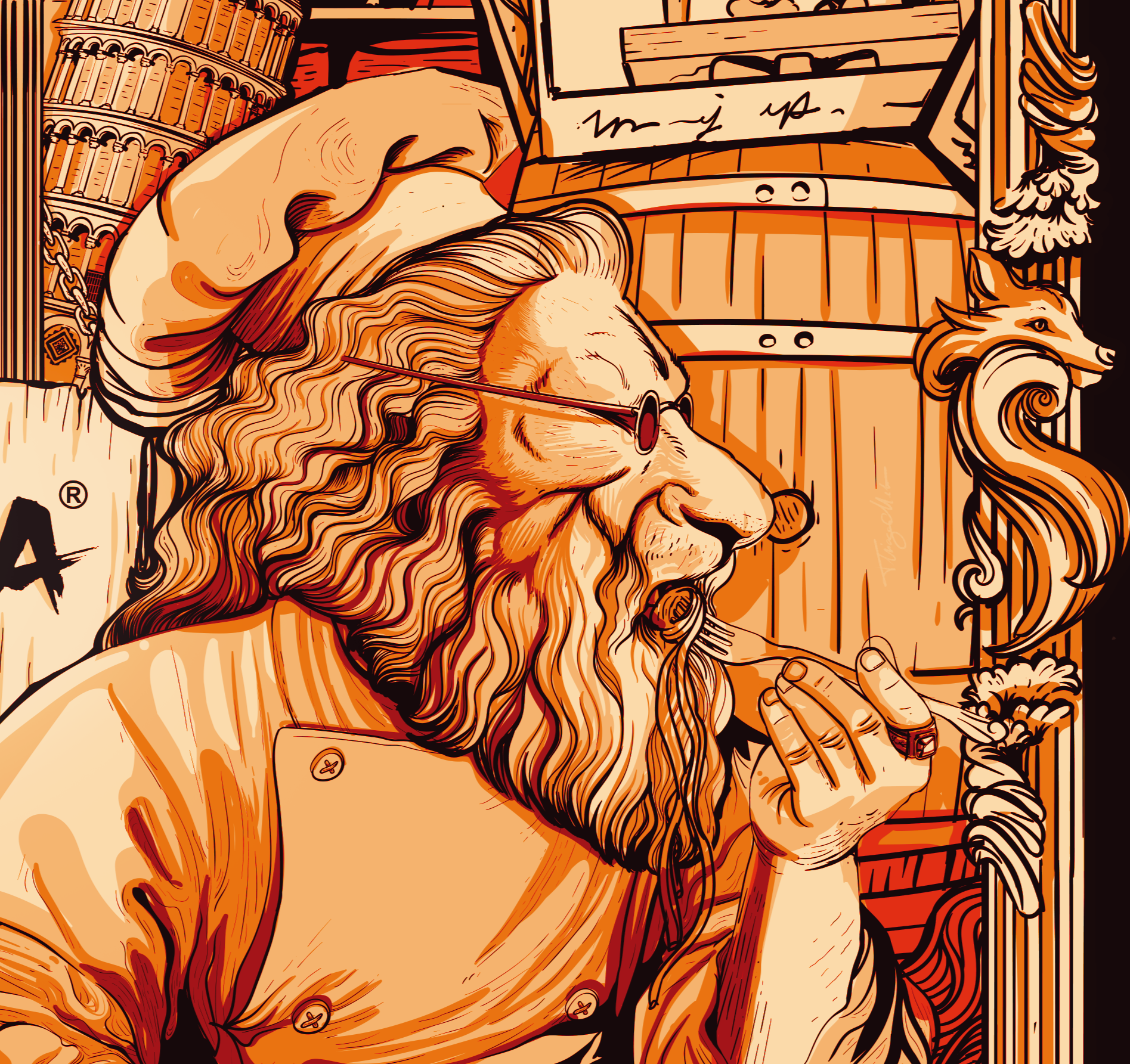 Aqui minha ideia foi mergulhar fundo na alma italiana para criar essa belezura que ilustra tradição, nobreza e sabor. Bati no liquidificador símbolos como o leão alado e colunas ornamentadas para evocar realeza e história. Usei a loba -da fundação de Roma – como figura central numa cena familiar, onde a mãe loba serve macarronada aos filhos, ao lado de um garçom-garça: um trocadilho visual que também simboliza equilíbrio e sabedoria. Além disso tem os queijos, vinhos, salames e barris, pra dar ainda mais o clima de uma osteria italiana, com a Fonte di Trevi e monumentos como a Torre de Pisa e a estátua de Rômulo e Remo compondo o pano de fundo. Uma ode visual à Itália, com sabor, memória e arte em cada traço.